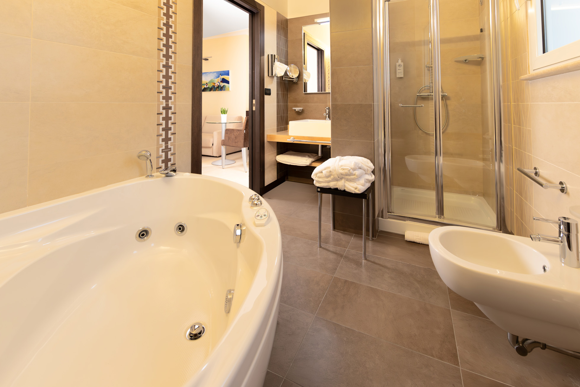 Alle dotazioni della camera Superior, si aggiungono: un grande bagno con vasca idromassaggio e doccia separate, la comoda cabina armadio, i 2 balconi verso il mare.