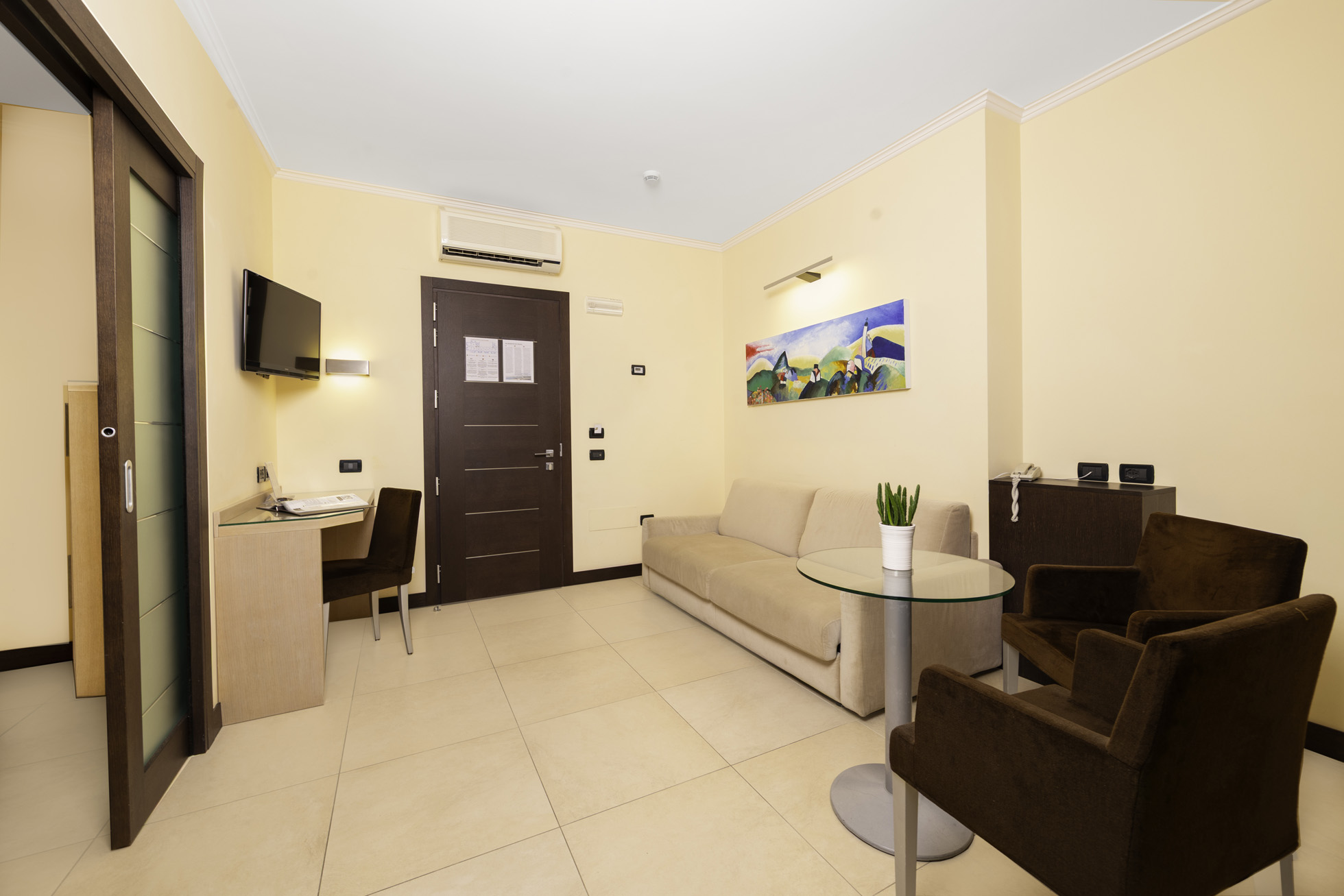 Il divano del soggiorno all’occorrenza si trasforma in un comodo letto matrimoniale, rendendo queste Suite ideali anche per una famiglia.
